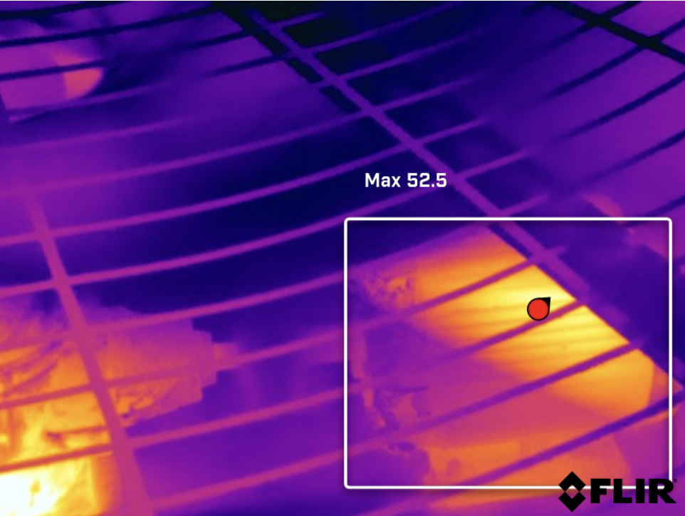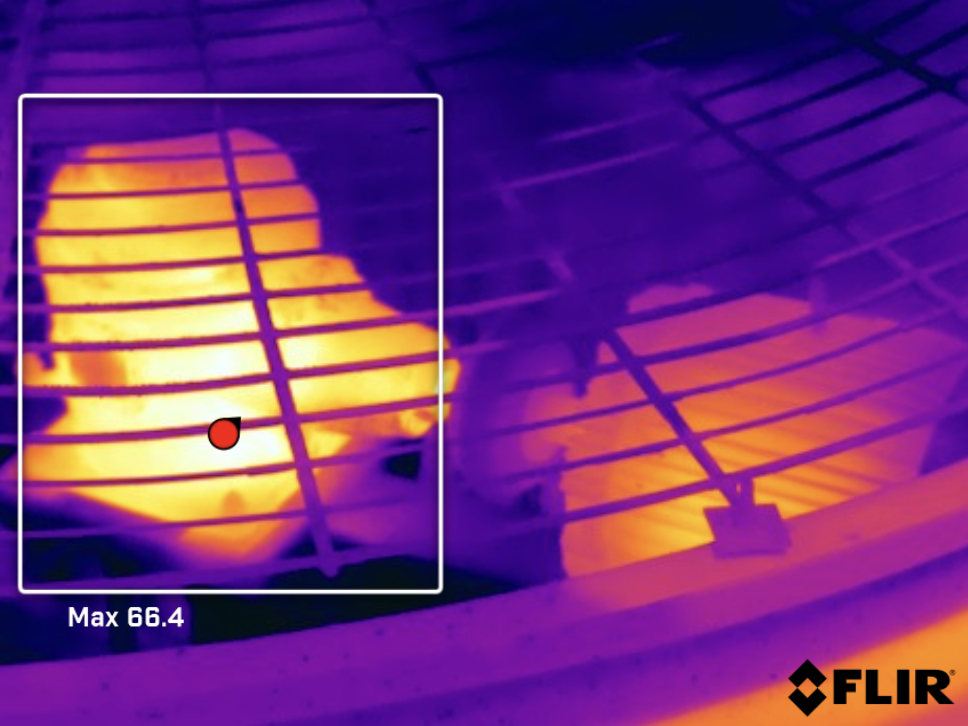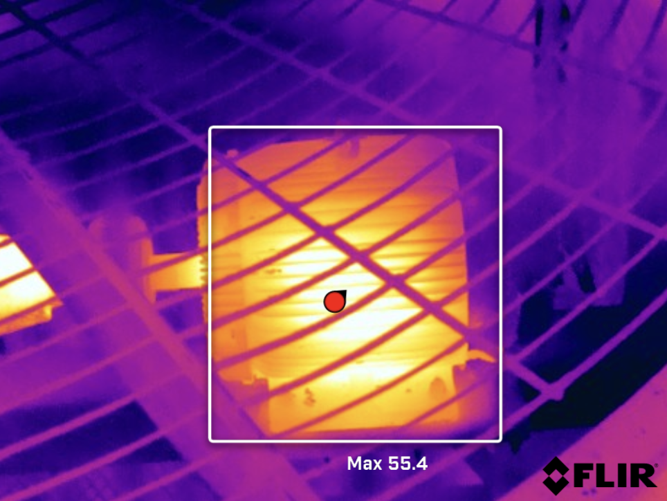 The fan of this cooling tower likely rotates between 900 and 1800 RPM. My FLIR E95 operates at 30 Hz (30 frames per second). If the fan were running near 1200 RPM (20 revolutions per second), the camera would capture about 1.5 frames per revolution — enough to occasionally “see” the motor through the gaps, though with some blur and reflection.