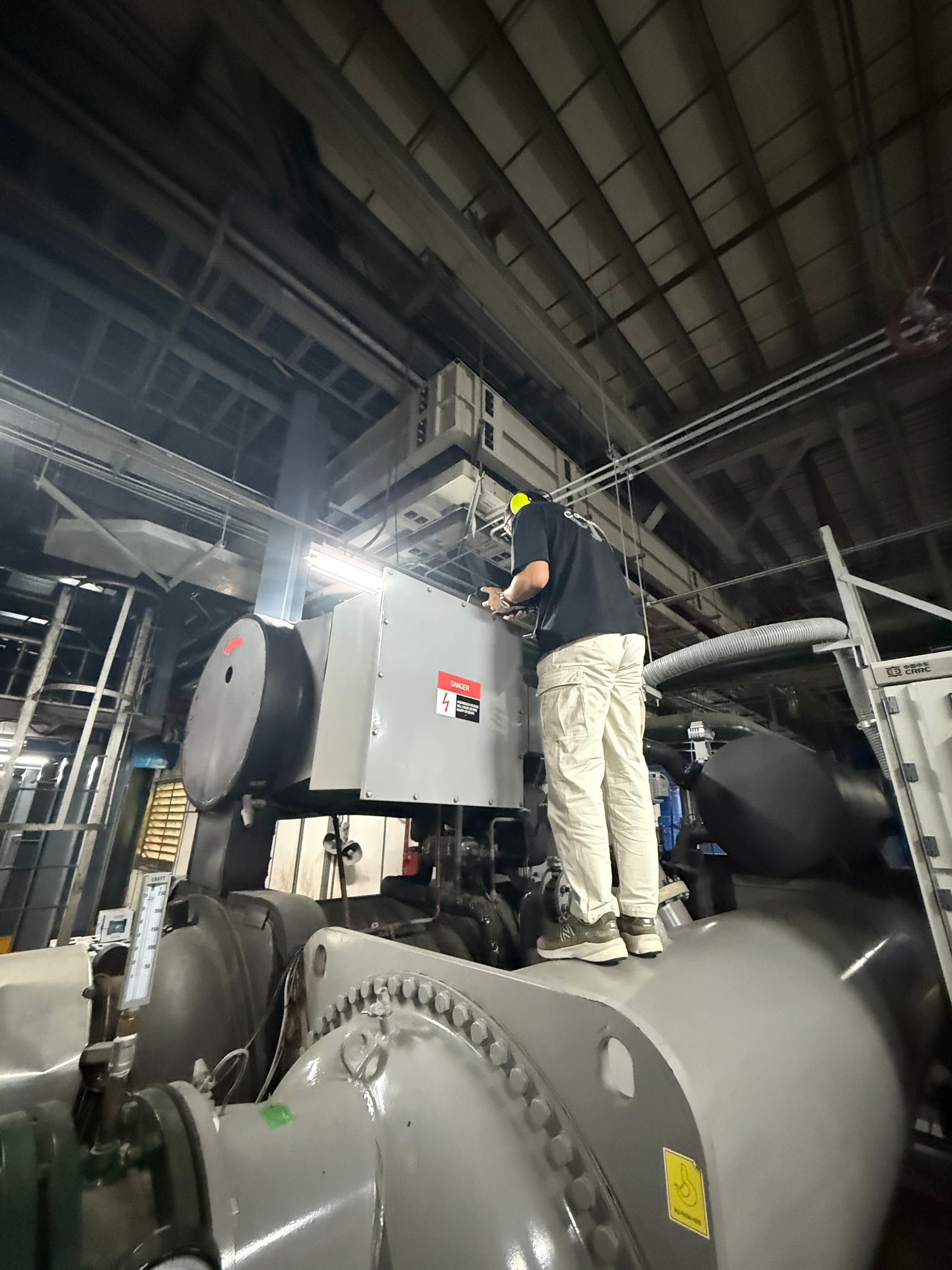 As Choy and I scanned Chiller #3 (which was offline), we were given permission to step on top of compressed tank to check the likely areas of leak and we found it.