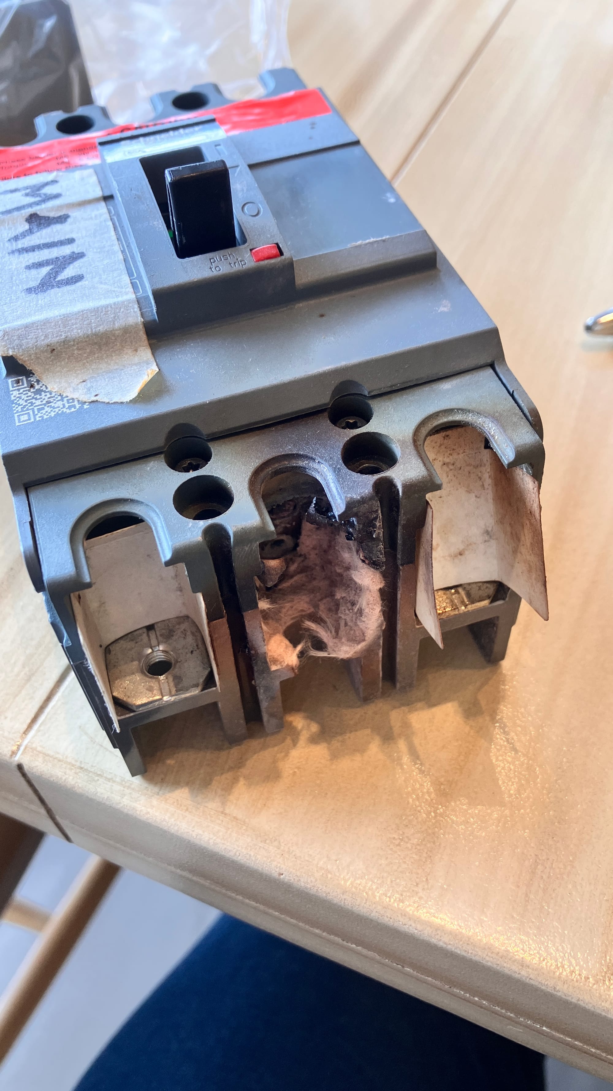 The funny part of this story is that when it single phased a week ago (May 22nd), the engineers who service the motor and exhaust fan thought that the issue was the fan itself, without checking the electrical panel and breaker! When they replaced the fan and it didn't perform well, they thought it was the motor, so they replaced that too. I'm not sure where in the process this happened but they also added an inverter to make the motor VFD. This is what I heard but the control panel for the VFD also failed (maybe the breaker). This incident finally led the engineers to look at the electrical panel and voila! they realized that there was a catastrophic failure at the MAIN exhaust fan breaker. The entire time I was thinking how this could possibly have happened. I believe its because the electrical panel dead front covers up the failure so its not visible.