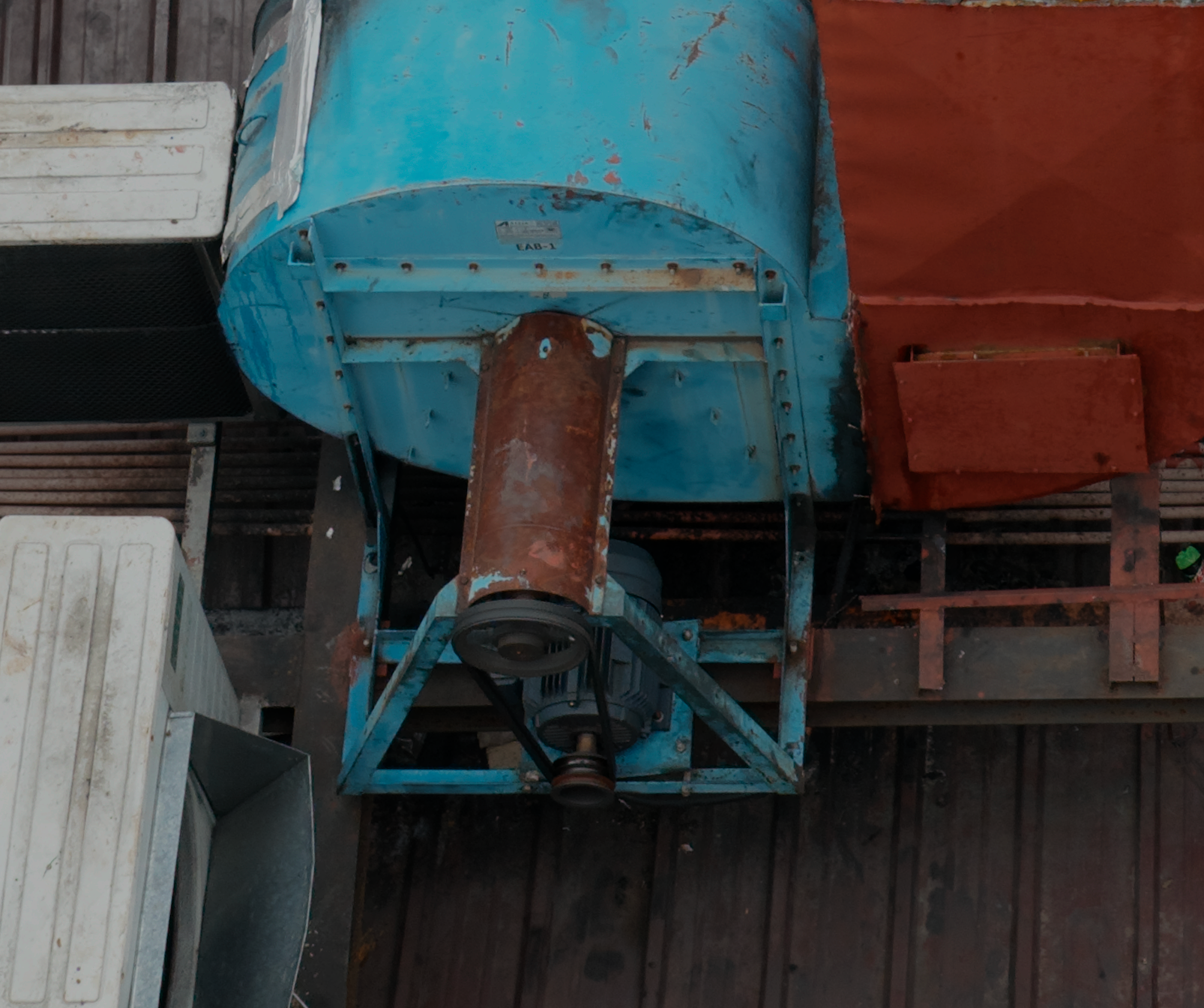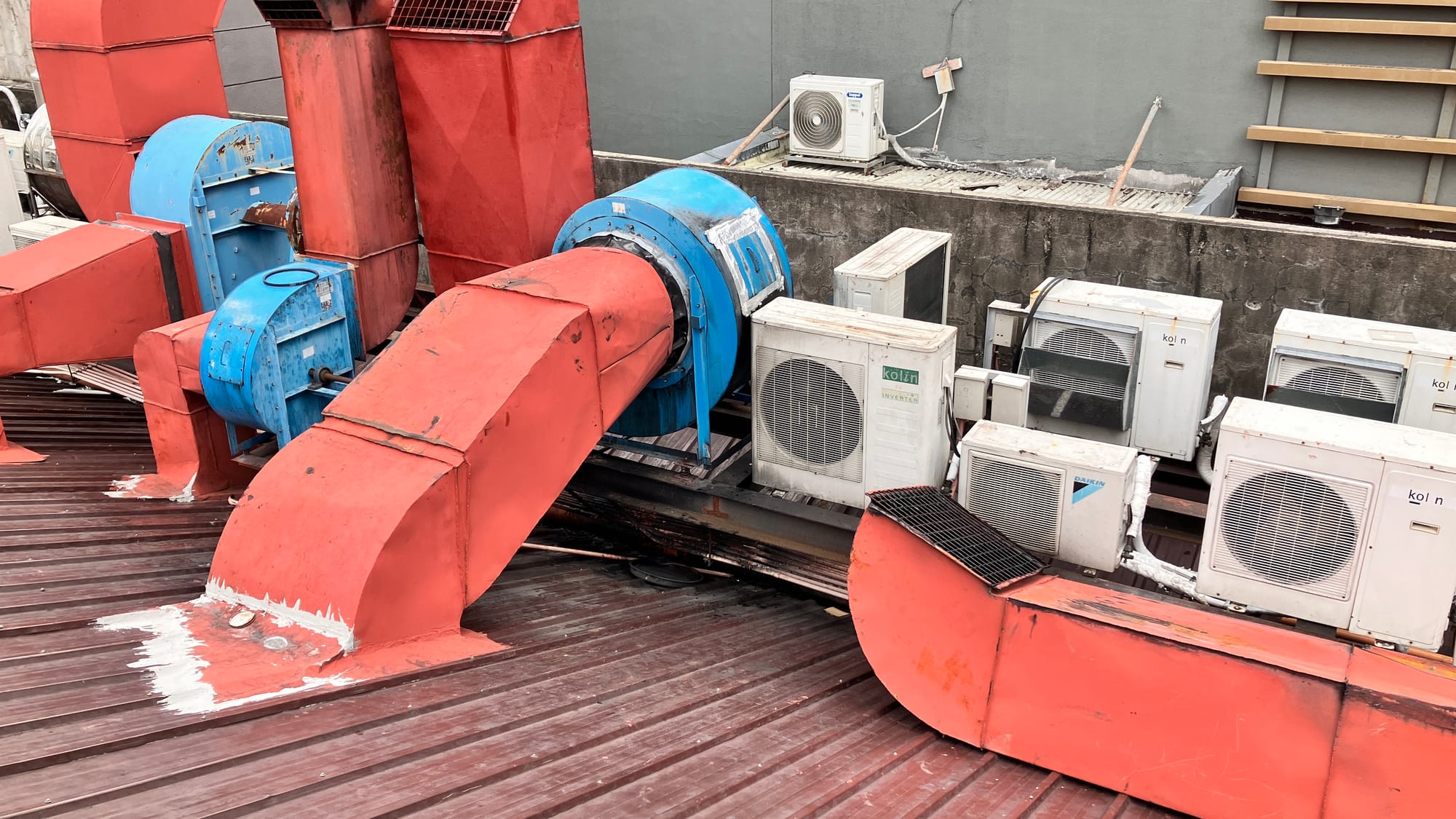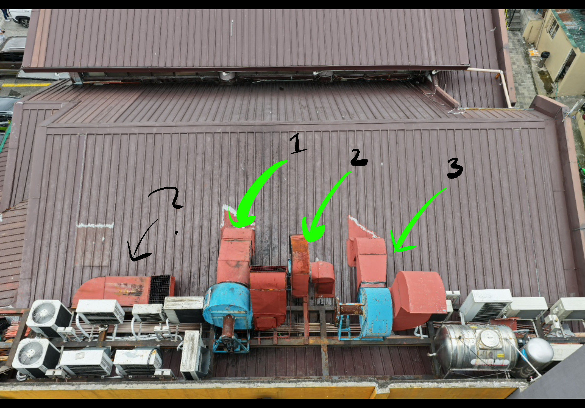 There's 3 centrifugal exhaust fans and one more exhaust on the left (?) that may be a condenser unit, which releases indoor heat to the outside air. These 3 motors is what we have to check. I haven't inspected these types of motors before but it seems like sensor placement for ultrasound and vibration isn't too challenging for the motor. However sensor placement on the driven side is not good. I'm afraid the shaft guard is in the way and we need to remove it.
